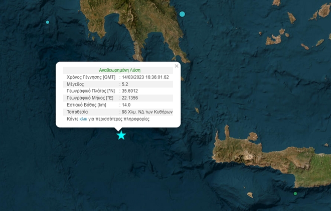Σεισμική δόνηση μεγέθους 5,2 βαθμών της κλίμακας Ρίχτερ σημειώθηκε το απόγευμα της Τρίτης (14/03) ανοιχτά των Κυθήρων.