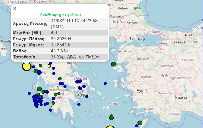 Σύμφωνα με το Γεωδυναμικό Ινστιτούτο, ο σεισμός έγινε στις 16:54 ώρα Ελλάδος, με εστιακό βάθος 43,2 χλμ, ενώ το επίκεντρό του ήταν 31 χλμ ΒΔ των Παξών.