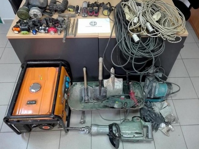 Στο χώρο της παράνομης ανασκαφής εντοπίσθηκαν μέσα και εργαλεία που χρησιμοποιούσαν. Συγκεκριμένα βρέθηκαν και κατασχέθηκαν: μία ηλεκτρογεννήτρια, αντισφυξιογόνες μάσκες, 11 ηλεκτρικά και άλλα εργαλεία (φτυάρια, τρυπάνια κ.α.), δύο φορητές συσκευές ενδοεπικοινωνίας και διάφορα άλλα αντικείμενα (γάντια εργασίας, φακοί, μετροταινία κ.α.).