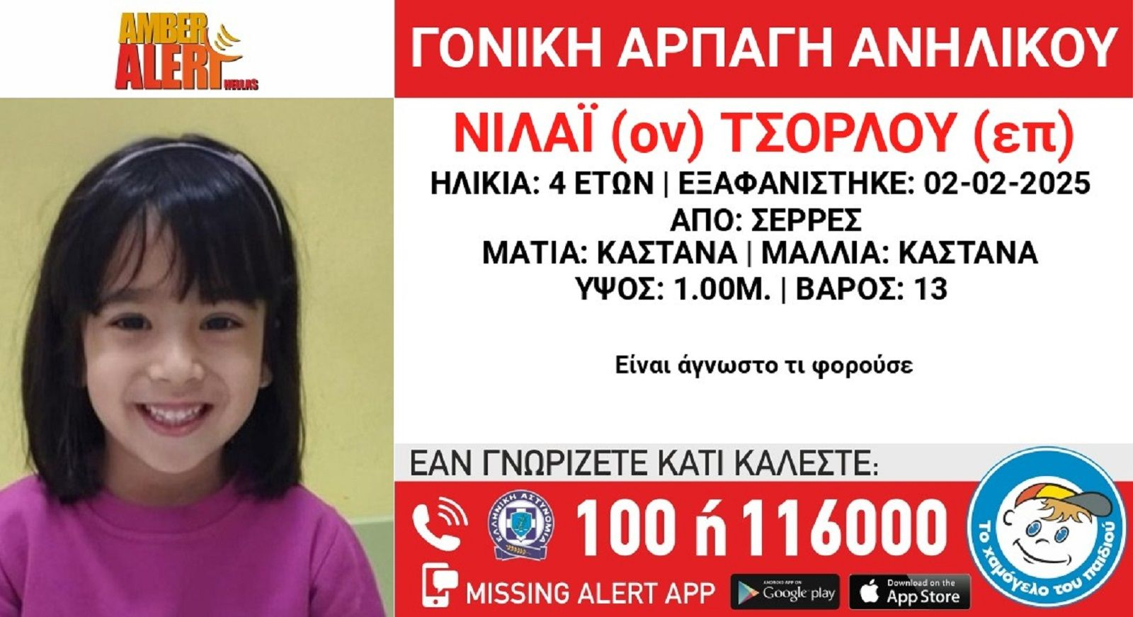 Πληροφορίες της Αστυνομίας αναφέρουν ότι η 4χρονη έπεσε θύμα αρπαγής από τον πατέρα της. Η ανακοίνωση από το “Χαμόγελο του Παιδιού”.