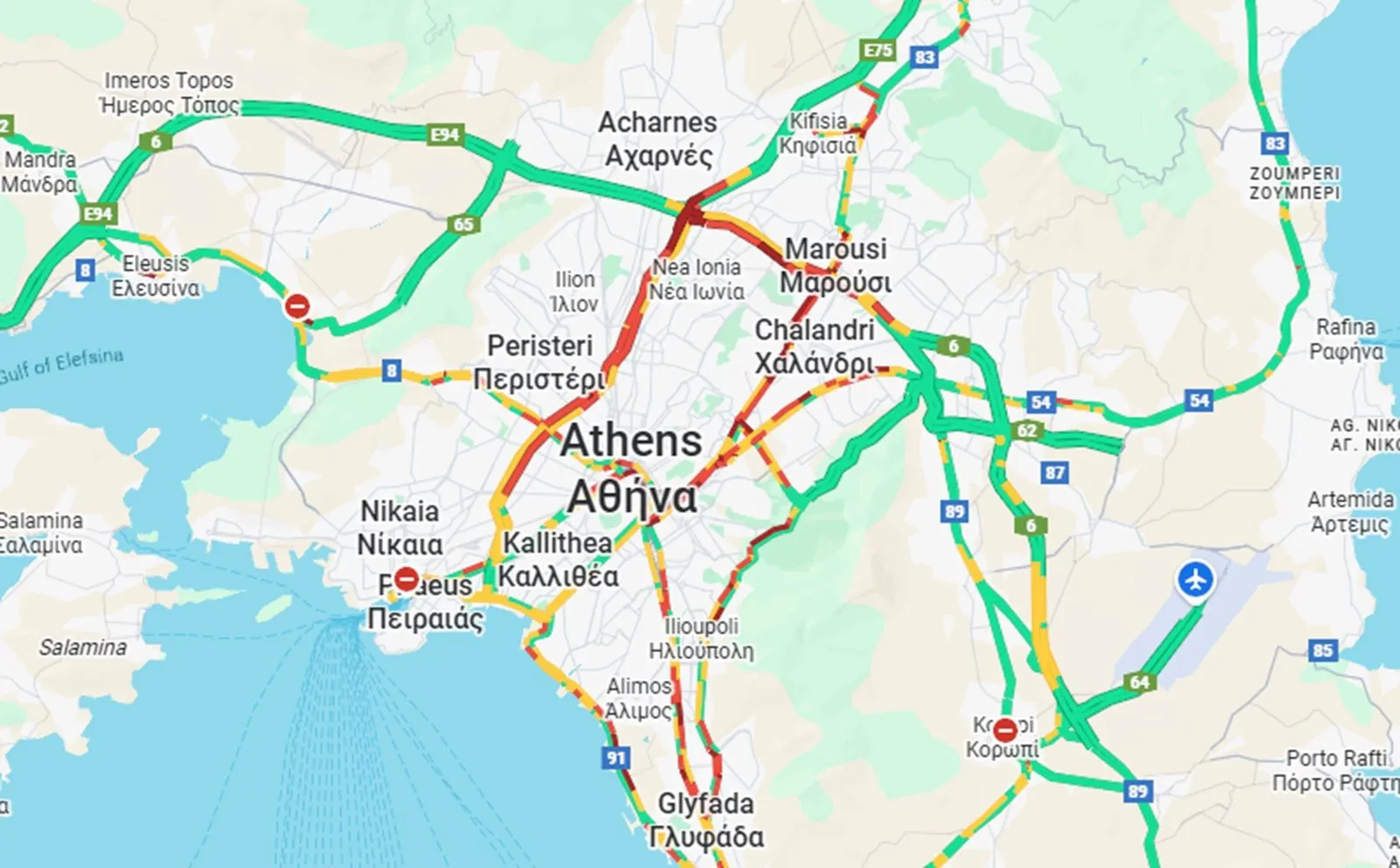 Πολλοί δρόμοι βρίσκονται στο “κόκκινο”, με τον Κηφισό να παρουσιάζει για μια ακόμη φορά την πιο προβληματική εικόνα.