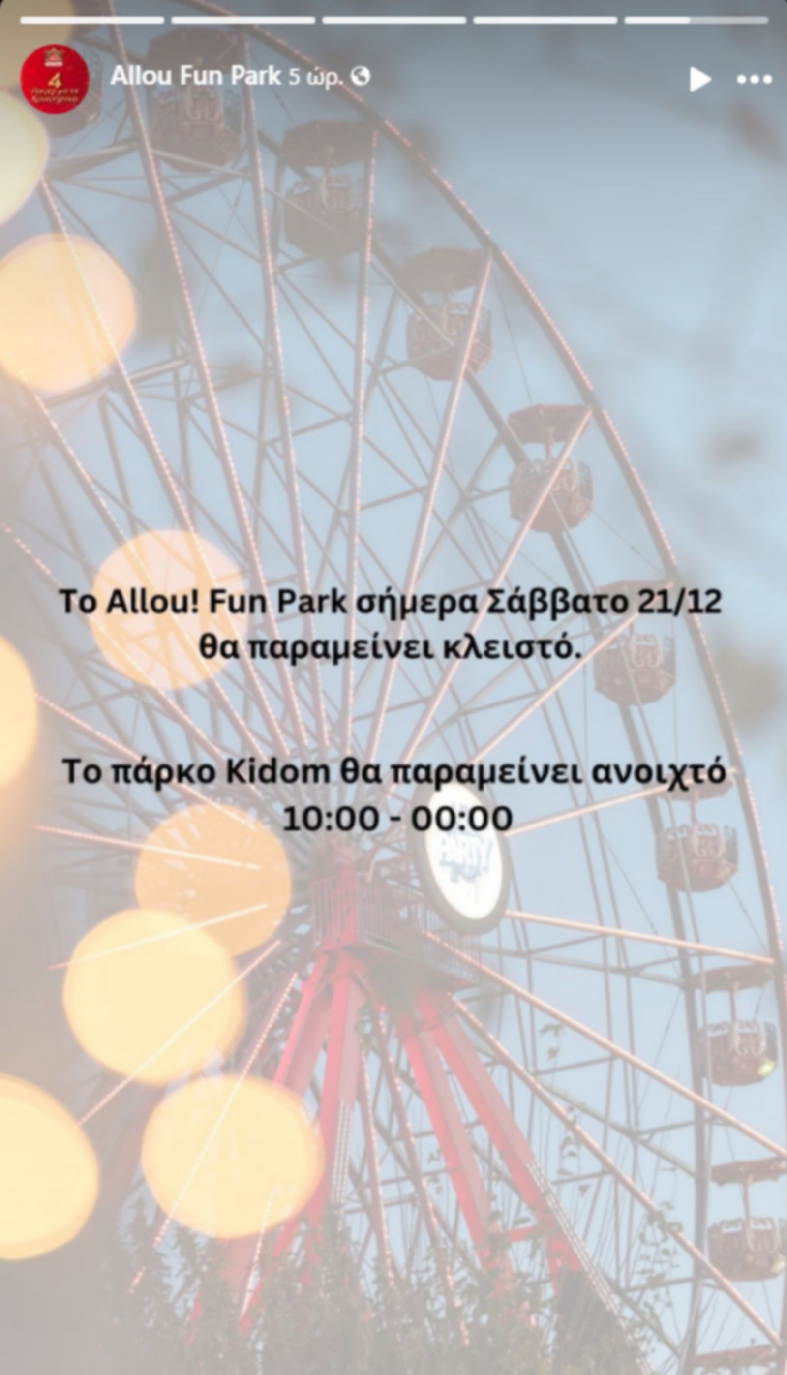 Το «Allou! Fun Park», σε ενημέρωση του κοινού μέσω των social media, αναφέρει ότι για σήμερα, Σάββατο (21/12), το «Allou! Fun Park» θα παραμείνει κλειστό, ενώ το πάρκο Kidom θα παραμείνει ανοιχτό 10:00 – 12:00.