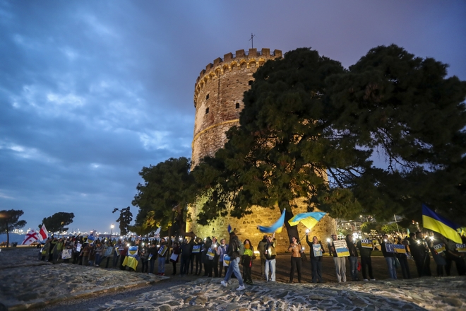Στην Θεσσαλονίκη Ουκρανοί σχημάτισαν μία ανθρώπινη αλυσίδα στον Λευκό Πύργο ενώ εκδήλωση πραγματοποιείται και έξω από την Σχολή Καλών Τεχνών.