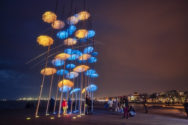 Παράλληλα, οι ομπρέλες του Ζογγολόπουλου φωτίστηκαν με τα χρώματα της ουκρανικής σημαίας, τιμώντας τα θύματα του πολέμου.
