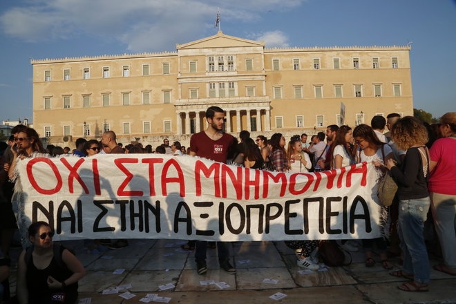 Στην πλατεία Συντάγματος συγκεντρώθηκαν το απόγευμα της Δευτέρας οι διοργανωτές πρωτοβουλίας υπέρ του «όχι» στο δημοψήφισμα.