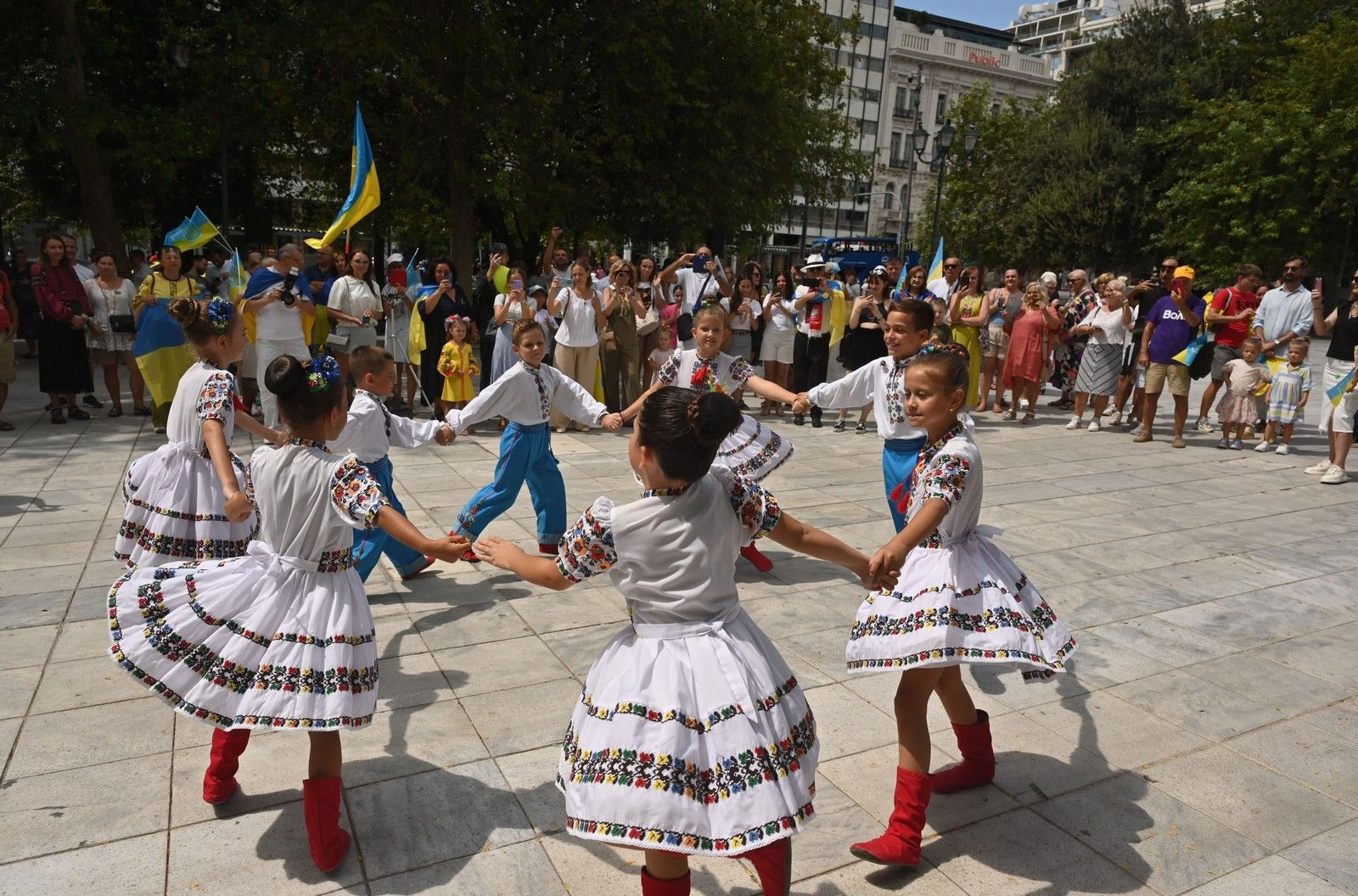 Ουκρανοί άνδρες, γυναίκες και παιδιά έδωσαν δυναμικό «παρών» στην εκδήλωση, κρατώντας στα χέρια τους σημαίες της Ουκρανίας, αλλά και της Ελλάδας και της Ευρωπαϊκής Ένωσης, θέλοντας έτσι να υπογραμμίσουν τους δεσμούς φιλίας και αλληλεγγύης που ενώνουν τους λαούς. Η ατμόσφαιρα ήταν φορτισμένη συναισθηματικά, καθώς τα μηνύματα που κυριάρχησαν είχαν διπλό χαρακτήρα: από τη μία τον εορτασμό της ανεξαρτησίας της πατρίδας τους, και από την άλλη την καταγγελία της συνεχιζόμενης ρωσικής επιθετικότητας.
