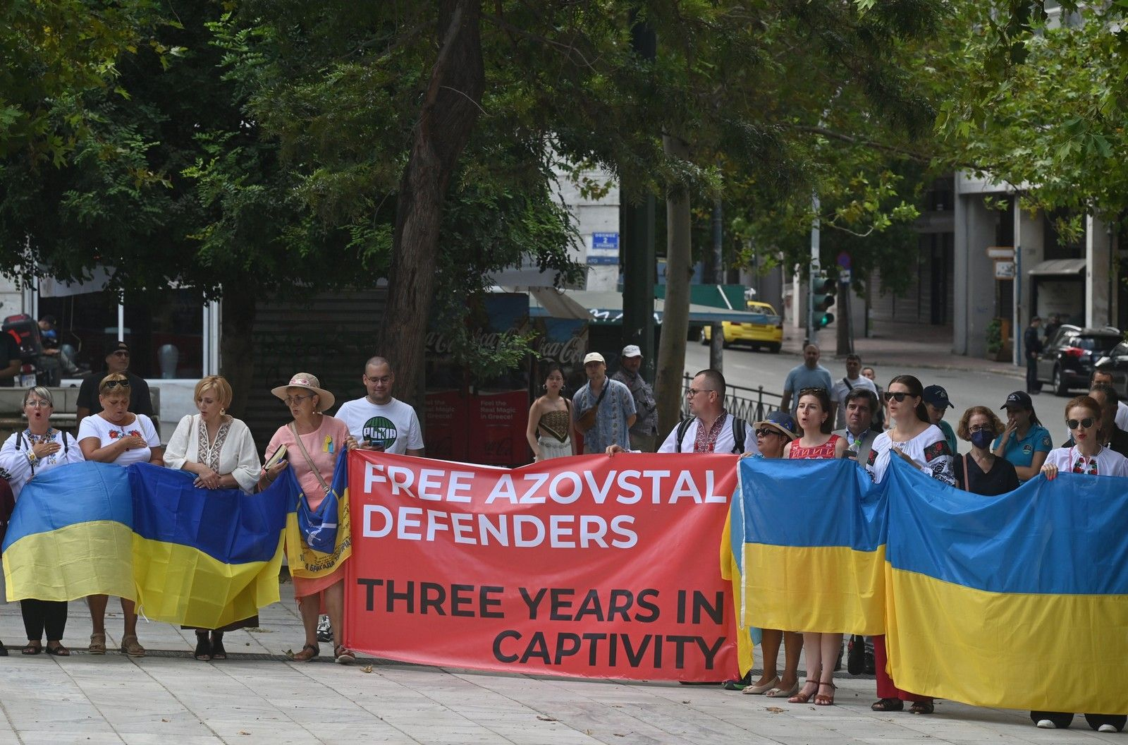 Με συνθήματα, πανό και τραγούδια, οι συγκεντρωμένοι εξέφρασαν την αμετακίνητη θέλησή τους να δουν την Ουκρανία ελεύθερη, ανεξάρτητη και ειρηνική.