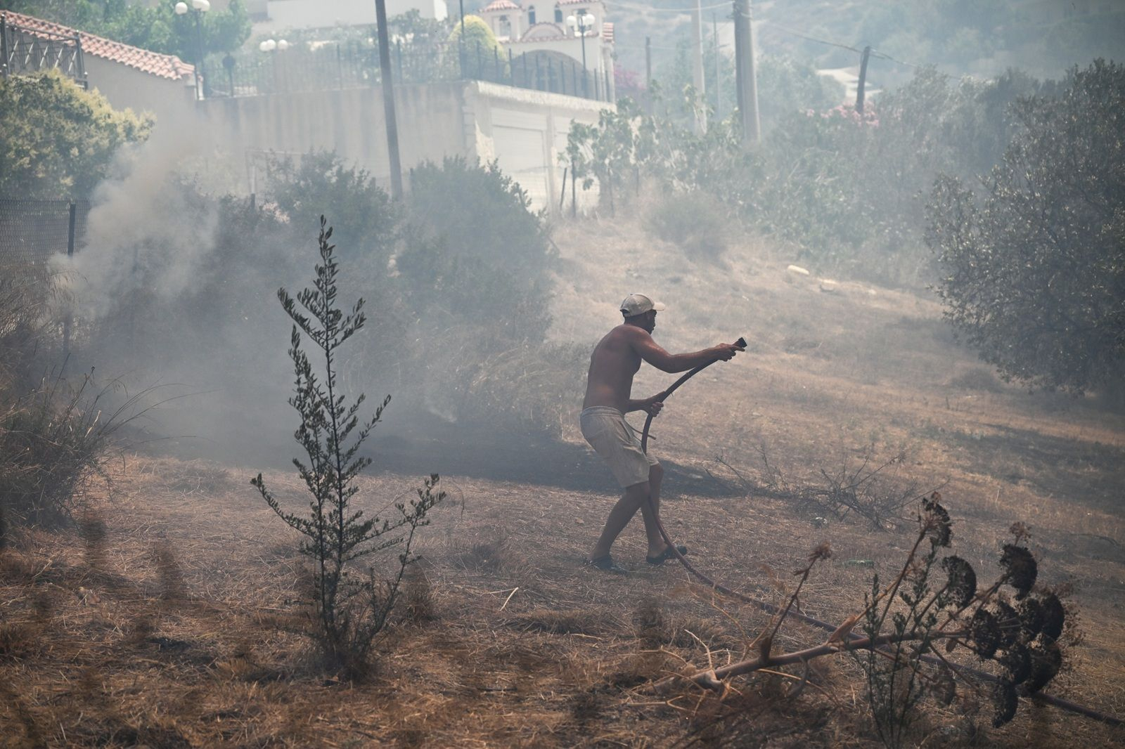 Κάτοικος επιχειρεί μαζί με τους πυροσβέστες στη κατάσβεση της πυρκαγιάς στην Παλαιά Φώκαια Αττικής, Πέμπτη 26 Ιουνίου 2025. Μάχη με τις φλόγες συνεχίζουν να δίνουν οι πυροσβεστικές δυνάμεις στην πυρκαγιά που ξέσπασε λίγο μετά τις 12:30 σε χαμηλή βλάστηση ανάμεσα σε Θυμάρι και Παλαιά Φώκαια Αττικής. Όπως έγινε γνωστό από την Πυροσβεστική η φωτιά εκδηλώθηκε ανάμεσα σε κατοικίες με αποτέλεσμα να υπάρχουν αναφορές για καμένα σπίτια. Για τον λόγο αυτό τρία μηνύματα μέσω του 112 εστάλησαν σε κατοίκους προκειμένου να απομακρυνθούν από τις περιοχές Θυμάρι, Τουρκολίμανο, Καταφύγι και Χάρακα. ΑΠΕ-ΜΠΕ/ΑΠΕ-ΜΠΕ/ΓΙΩΡΓΟΣ ΒΙΤΣΑΡΑΣ ΓΙΩΡΓΟΣ ΒΙΤΣΑΡΑΣ/ΑΠΕ-ΜΠΕ