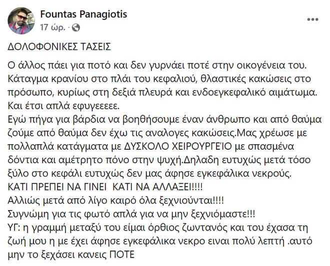 Ο Παναγιώτης Φούντας δημοσίευσε φωτογραφίες του από το νοσοκομείο ύστερα από τον ξυλοδαρμό που υπέστη. “Πήγα για βάρδια, να βοηθήσουμε έναν άνθρωπο και από θαύμα ζούμε” σημείωσε ο διασώστης μεταξύ άλλων ενώ πρόσθεσε πως “Η γραμμή μεταξύ του είμαι όρθιος ζωντανός και του έχασα τη ζωή μου ή με έχει άφησε εγκεφάλικα νεκρό είναι πολύ λεπτή”.