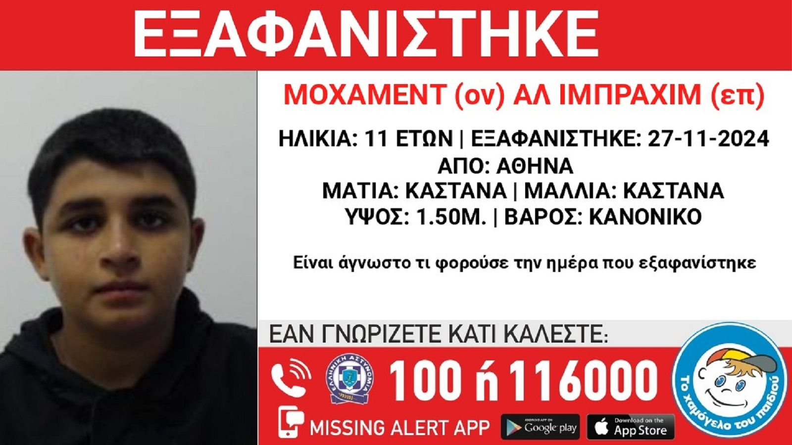 Συναγερμός έχει σημάνει στις Αρχές για την εξαφάνιση του 11χρονου Μοχάμεντ Αλ Ιμπραχιμ, συριακής καταγωγής, τα ίχνη του οποίου χάθηκαν από την περιοχή της Αθήνας, όπου είχε μεταβεί από χώρο φιλοξενίας που διέμενε.