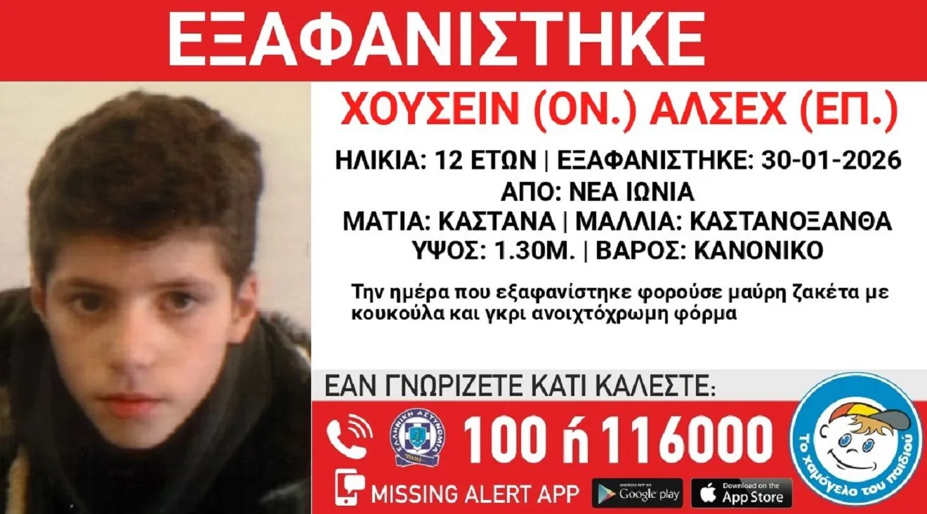 Συναγερμός έχει σημάνει στις αρχές για την εξαφάνιση του 12χρονου HUSSEIN (ον.) ALSHEH (επ.), συριακής καταγωγής, τα ίχνη του οποίου χάθηκαν το μεσημέρι της Παρασκευής (30/1) από χώρο φιλοξενίας ασυνόδευτων ανηλίκων στην περιοχή της Νέας Ιωνίας.