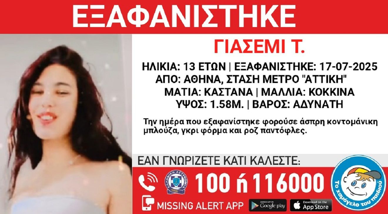 Συναγερμός σήμανε στις αρχές για την εξαφάνιση της 13χρονης Γιασεμί Τ., τα ίχνη της οποίας χάθηκαν το βράδυ της Πέμπτης (17/07) πό την περιοχή της Αθήνας και συγκεκριμένα από τη στάση του μετρό “Αττική”.