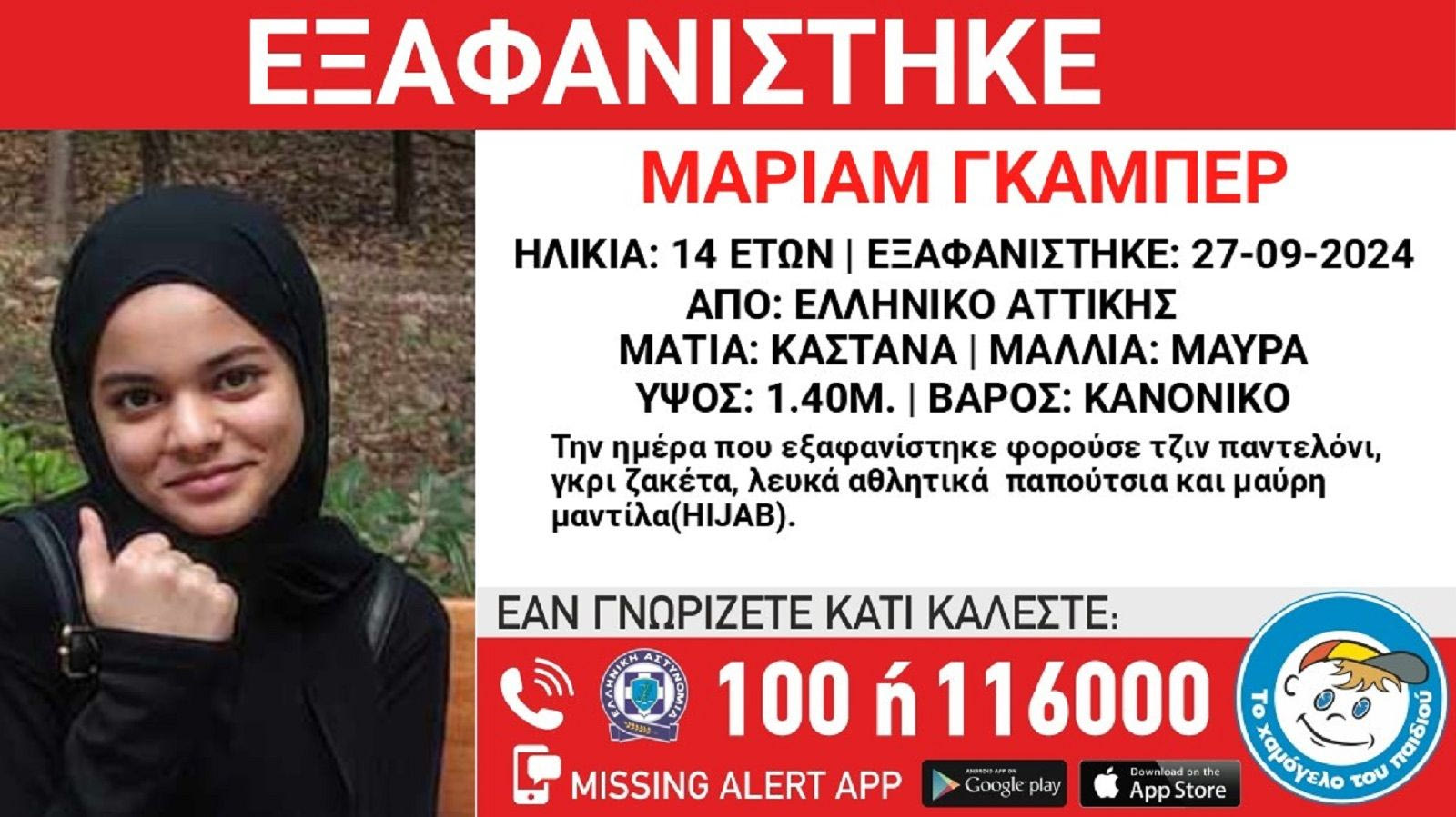 Συναγερμός έχει σημάνει στις Αρχές για την εξαφάνιση της 14χρονης Μαριάμ Γκαμπέρ (αιγυπτιακής καταγωγής), τα ίχνη της οποίας χάθηκαν το πρωί της Παρασκευής (27/09) από την περιοχή του Ελληνικού.