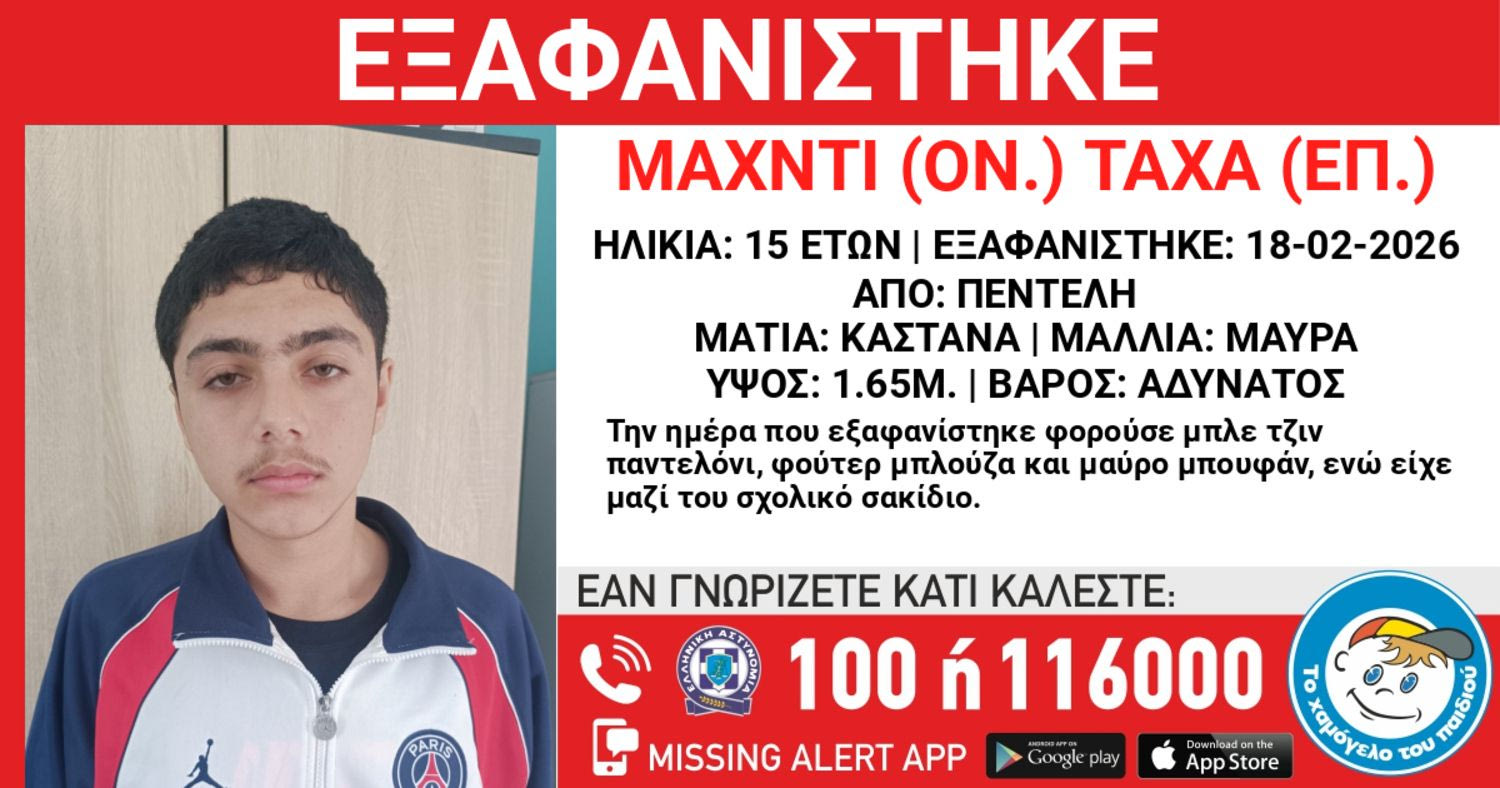 Συναγερμός έχει σημάνει στις αρχές για την εξαφάνιση του 15χρονου Μαχντί Τάχα, συριακής καταγωγής, τα ίχνη του οποίου χάθηκαν το πρωί της Τετάρτης (18/02) από την περιοχή της Πεντέλης.