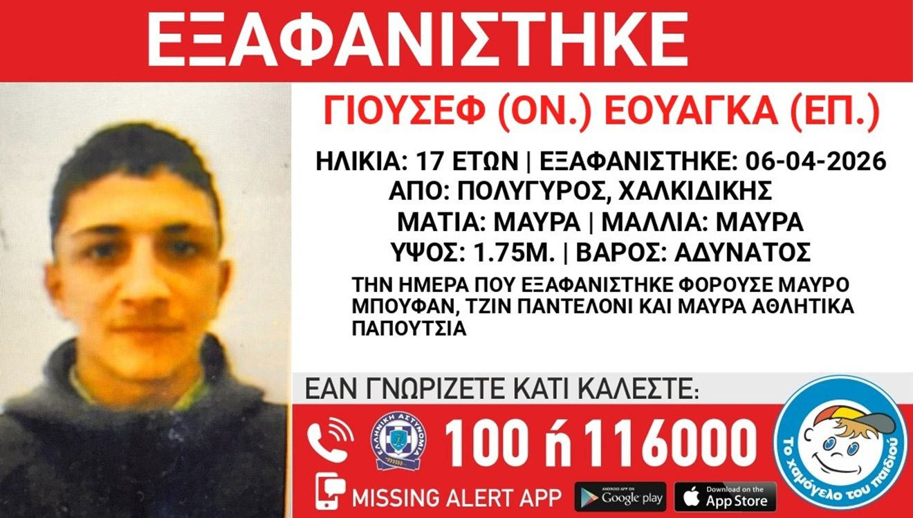 Συναγερμός έχει σημάνει στις αρχές για την εξαφάνιση του 17χρονου Εουάντα (επ.) Γιουσέφ (ον.), αιγυπτιακής καταγωγής, τα ίχνη του οποίου χάθηκαν το πρωί της Τρίτης (6/4) από χώρο φιλοξενίας ασυνόδευτων ανηλίκων στην περιοχή του Πολύγυρου, Χαλκιδικής.