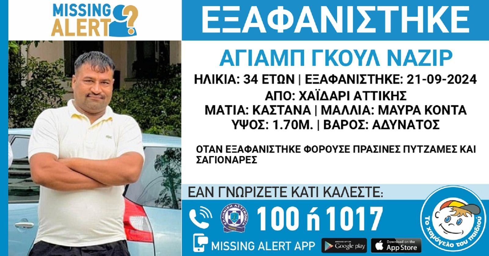 Συναγερμός έχει σημάνει στις Αρχές για την εξαφάνιση του 33χρονου Αγιάμπ Γκουλ Ναζίρ, από το Πακιστάν, τα ίχνη του οποίου χάθηκαν στις 21/09/2024, από την περιοχή του Χαϊδαρίου Αττικής.
