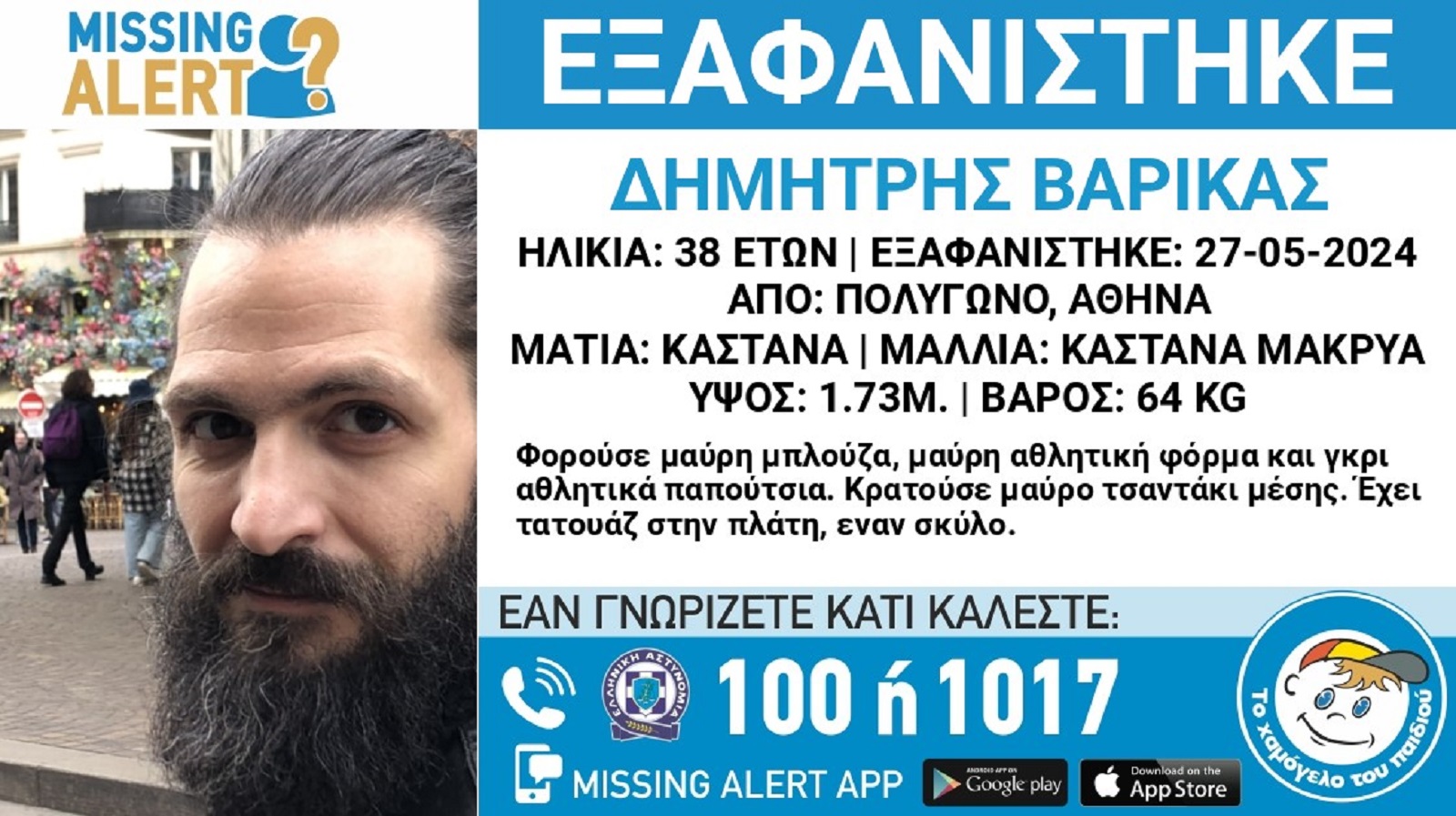 Συναγερμός έχει σημάνει στις Αρχές για την εξαφάνιση του 38χρονου Δημήτρη Βαρίκα, τα ίχνη του οποίου χάθηκαν το απόγευμα της Δευτέρας (27/05) από το Πολύγωνο στην Αθήνα.