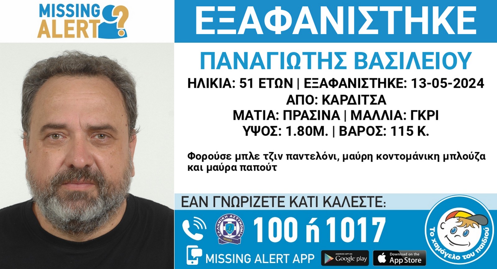 Συναγερμός έχει σημάνει στις Αρχές για την εξαφάνιση του 51χρονου Παναγιώτη Βασιλείου, τα ίχνη του οποίου χάθηκαν το μεσημέρι της Δευτέρας (13/05) από την Καρδίτσα.