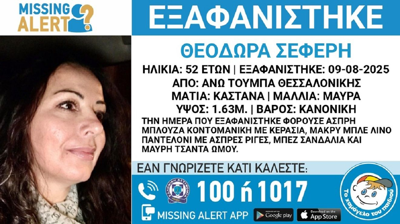 Συναγερμός σήμανε στις αρχές για την εξαφάνιση της 52χρονης Θεοδώρας Σεφέρη, τα ίχνη της οποίας χάθηκαν το πρωί του Σαββάτου από την περιοχή της Άνω Τούμπας, στη Θεσσαλονίκη.