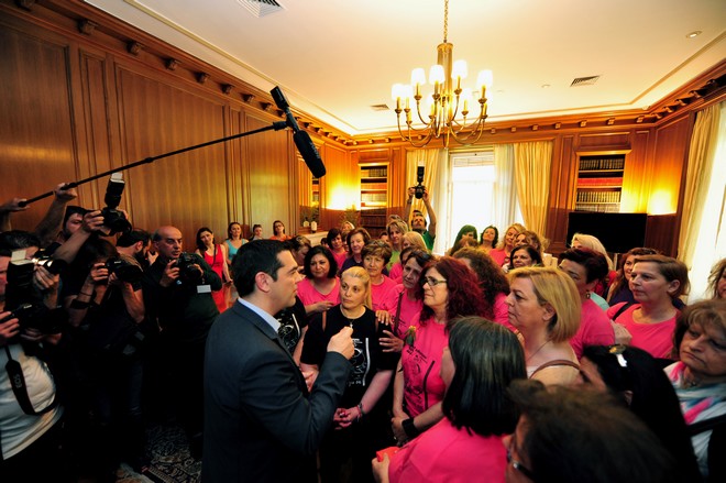 Σε κλίμα συγκίνησης πραγματοποιήθηκε η συνάντηση του Έλληνα πρωθυπουργού και προέδρου του ΣΥΡΙΖΑ με τις καθαρίστριες του υπουργείου Οικονομικών στο Μέγαρο Μαξίμου. Τις περίπου 50 καθαρίστριες υποδέχθηκε ο ίδιος o πρωθυπουργός, Αλέξης Τσίπρας στον προαύλιο χώρο του Μεγάρου, όπου συζήτησαν τις εξελίξεις μετά την ψήφιση της τροπολογίας που τους δίνει τη δυνατότητα να επιστρέψουν στις εργασίες τους.