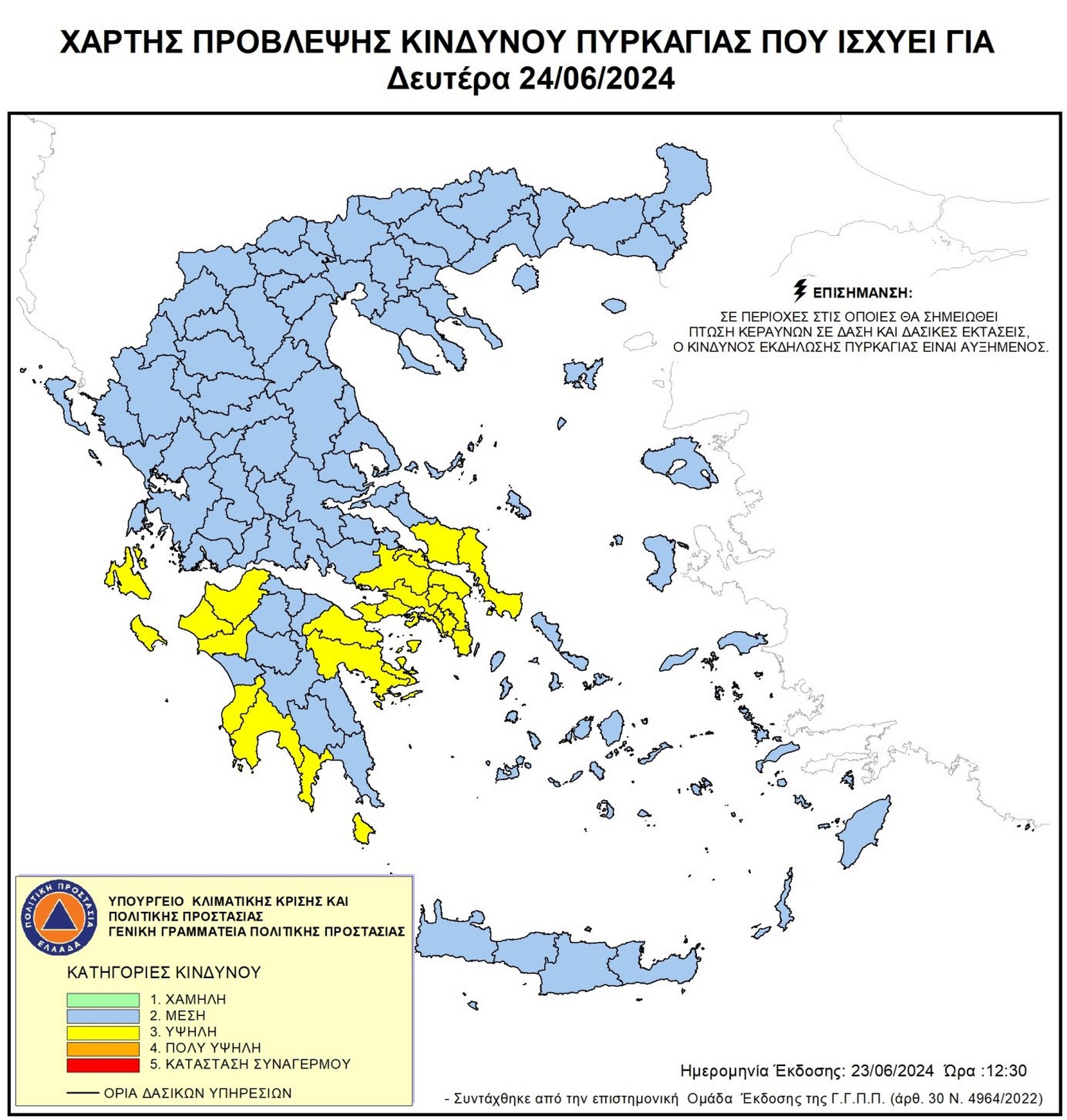 Υψηλός είναι ο κίνδυνος πυρκαγιάς την Δευτέρα στην Αττική και σε περιοχές της Πελοποννήσου. Στην υπόλοιπη Ελλάδα, όπως φαίνεται και στον Χάρτη Πρόβλεψης Κινδύνου Πυρκαγιάς της Πολιτικής Προστασίας, η κατηγορία κινδύνου κρίνεται “μέση”.