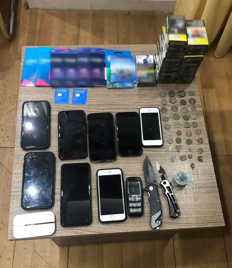 Σε περαιτέρω έρευνα βρέθηκαν επιπλέον στο όχημα και κατασχέθηκαν δύο αναδιπλούμενα μαχαίρια, 18 πακέτα τσιγάρων για τα οποία δεν έχουν καταβληθεί στο δημόσιο οι ανάλογοι φόροι και δασμοί, 27 νομίσματα και 10 τμήματα νομισμάτων για τα οποία διερευνάται αν εμπίπτουν στις διατάξεις της νομοθεσίας περί προστασίας των αρχαιοτήτων και εν γένει της πολιτιστικής κληρονομιάς, ένας μεταλλικός τρίφτης, 9 κινητά τηλέφωνα και 12 κάρτες (sim), μία ηλεκτρονική συσκευή και το χρηματικό ποσό των 700 ευρώ. Κατασχέθηκε επίσης το παραπάνω όχημα.