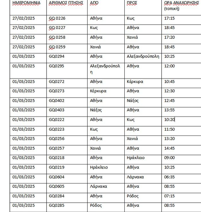 Σημειώνεται πως οι πτήσεις GQ650 (LCA-SKG) και GQ651 (SKG-LCA) που ήταν αρχικά προγραμματισμένες για την 28/02/205 δεν θα ακυρωθούν, αλλά θα επανάπρογραμματιστούν με νέα ώρα αναχώρησης.