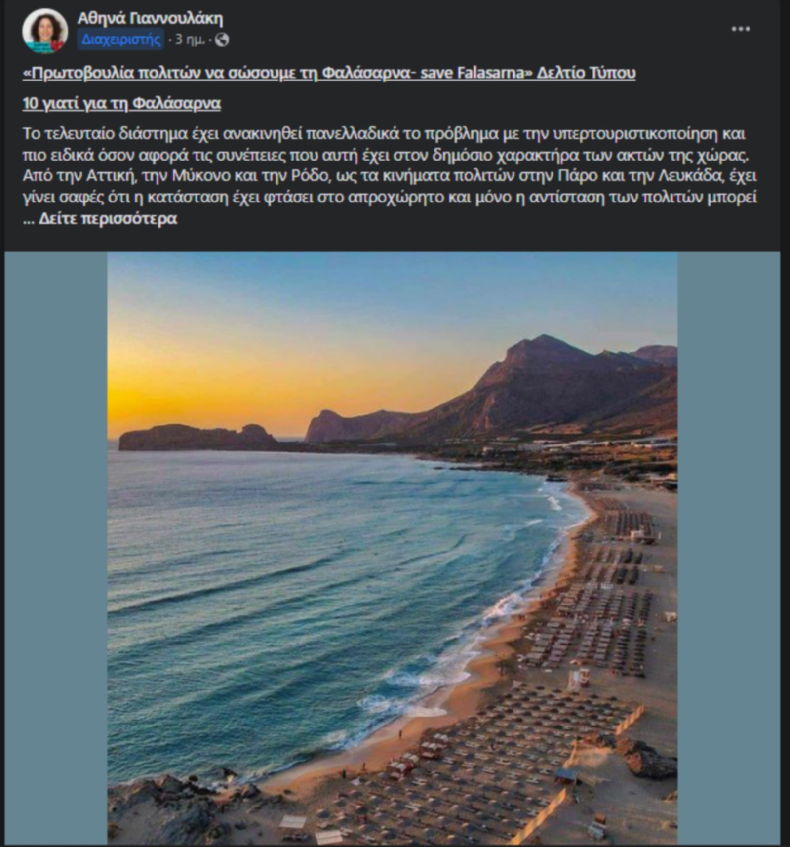 Όσον μας αφορά ως κίνηση έχουμε αναδείξει τις προσπάθειες συγκεκριμένου επιχειρηματία να ιδιωτικοποιήσει και ιδιοποιηθεί την παραλία παχιά άμμος (μεγάλη παραλία) στη Φαλάσαρνα, μέσω ενός φαραωνικού τουριστικού χωριού!!! Μια παραλία που έχει αξιολογηθεί από εκατομμύρια επισκέπτες ως μία από τις 25 καλύτερες παραλίες στον κόσμο.