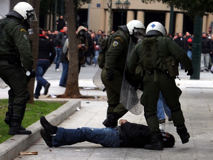 13:50 ΜΑΤ κλωτσάνε διαδηλωτή που έχει πέσει αναίσθητος στο έδαφος
