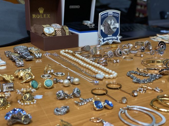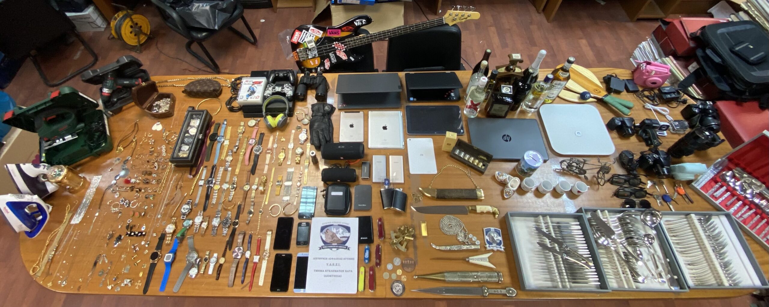 Από τις έρευνες βρέθηκε και κατασχέθηκε πλήθος από κοσμήματα, ασημικά, ρολόγια, επώνυμα δερμάτινα είδη, ηλεκτρονικές συσκευές, φορητούς ηλεκτρονικούς υπολογιστές, μουσικά όργανα, αλκοολούχα ποτά, κινητά τηλέφωνα, αποδείξεις και κάρτες μεταφοράς χρημάτων, συναλλαγές με ενεχυροδανειστήρια, διαρρηκτικά εργαλεία, κλειδαριές, δύο “επιχειρησιακά” αυτοκίνητα και το χρηματικό ποσό των 6.220 ευρώ.