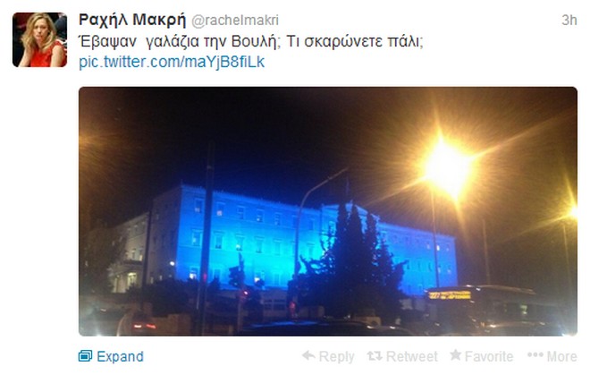 “Έβαψαν γαλάζια τη Βουλή. Τι σκαρώνετε πάλι;” έγραψε.