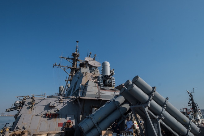 Κάθετα, μέσα και κάτω από αυτά τα μεταλλικά «καπάκια», βρίσκεται, όπως επιβεβαίωσε ερωτηθείς από το ΑΠΕ-ΜΠΕ ο κ. Williamson, ένα μείγμα από όλους πυραύλους που μπορεί να φέρει το αντιτορπιλικό USS McFaul. Είτε αντιαεροπορικούς RIM-156 SM-2 που χάρη στα ηλεκτρονικού τύπου (τεχνολογία AESA) ραντάρ του σκάφους είναι ικανοί να χτυπήσουν ένα εχθρικό αεροσκάφος δεκάδες χιλιόμετρα στον αέρα, είτε πυραύλους RIM-161 Standard Missile 3 (SM-3) που λειτουργούν και ως μέρος αντιβαλλιστικής άμυνας ώστε να μην «φτάσει» ένας εχθρικό πύραυλος σε αυτό το σκάφος ή άλλο που συνοδεύει, είτε BGM-109 Tomahawk πύραυλοι που, αν χρειαστεί, μπορούν να επιφέρουν πλήγμα εκατοντάδες χιλιόμετρα μακριά από το σκάφος. Μαζί με τους εκτοξευτές Mk 141 Harpoon Missile Launcher SSM και τους τριπλούς εκτοξευτές τορπιλών Mk 32 το σύνολο αυτών των συστημάτων καθιστούν το USS McFaul μια από τις ισχυρότερες μονάδες επιφάνειας που έχουν «ρίξει άγκυρα» στη Θεσσαλονίκη τα τελευταία χρόνια.