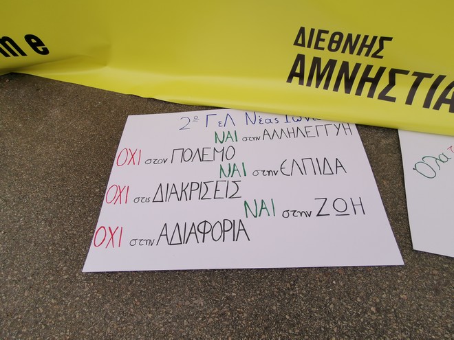 Τα παιδιά από το 2ο ΓΕΛ Νέας Ιωνίας, μαζί με μαθητές του 5ου Γυμνασίου Νέας Ιωνίας, του 1ου Γυμνασίου Ιλίου και του 3ου ΕΠΑΛ της Σιβιτανίδειου, πήγαν στην Αμυγδαλέζα, μαζί με κλιμάκιο της Διεθνούς Αμνηστίας, στο πλαίσιο του προγράμματος “Εγώ κι εσύ μαζί: Εκπαίδευση στα Ανθρώπινα δικαιώματα”. Στόχος της δράσης ήταν να τους δώσουν δώρα που έφτιαξαν στα σχολεία τους και γράμματα που είχαν γράψει τα ίδια τα παιδιά.