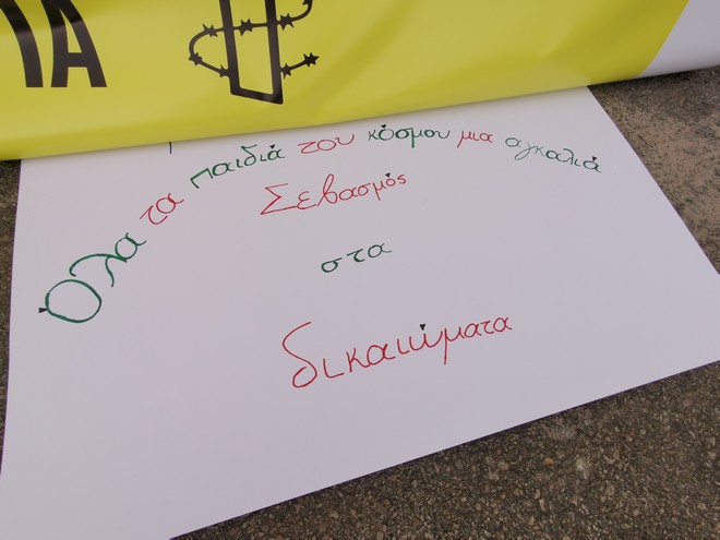 Παράλληλα, οι μαθητές φορώντας μπλούζες της Διεθνούς Αμνηστίας, κράτησαν ένα πανό που έγραφε “Κανένα παιδί σε κράτηση” διαμαρτυρόμενοι έτσι για την κράτηση ανηλίκων σε συνθήκες που δεν συνάδουν με τα διεθνή πρότυπα και τα δικαιώματα του παιδιού.