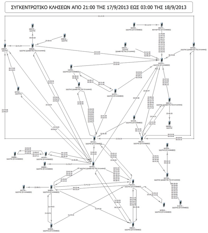 Από τα σχεδιαγράμματα που έρχονται στη δημοσιότητα από το υπουργείο Δημόσιας Τάξης φαίνεται πως ένας από τους συλληφθέντες εμφανίζεται να έχει επικοινωνήσει 14 φορές με έναν από τους έξι βουλευτές οι οποίοι έχουν συλληφθεί και ισάριθμες φορές με τα κεντρικά γραφεία της Χρυσής Αυγής.
