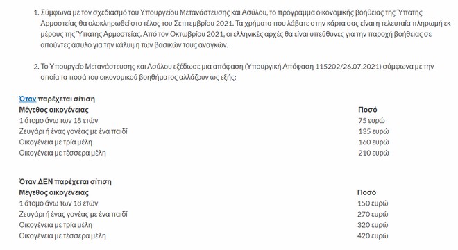 Στον παρακάτω πίνακα παρουσιάζονται τα ακριβή ποσά που λαμβάνουν μόνον οι αιτούντες ασύλου στην Ελλάδα, σε αντίθεση με αναρτήσεις στο διαδίκτυο που διακινούνται από ακροδεξιούς, ότι έκαστος μετανάστης στην Ελλάδα λαμβάνει 450 ευρώ το μήνα. Πέραν του ότι οι χρηματοδοτήσεις είναι από την ΕΕ, η διάρθρωση των ποσών που έχουν μειωθεί, αντηχεί την αλήθεια περί των όσων ισχύουν. Μάλιστα, οι ψευδείς ισχυρισμοί είχαν επανέλθει στην επιφάνεια μετά τις εξαγγελίες της ελληνικής κυβέρνησης για 150 ευρώ στους νεαρούς Έλληνες που θα εμβολιάζονταν κατά της Covid-19.