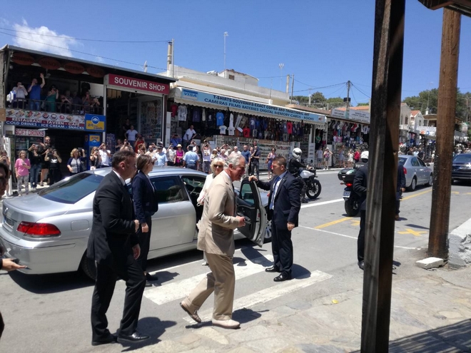 Ο πρίγκιπας Κάρολος και η δούκισσα Κορνουάλης Καμίλα, χαιρέτησαν και συνομίλησαν με τους τοπικούς φορείς και στη συνέχεια μπήκαν στο αυτοκίνητο προκειμένου να μεταφερθούν στην Κνωσό, όπου θα τους ξεναγήσει η υπουργός Πολιτισμού Λυδία Κονιόρδου και ηγενική γραμματέας του ΥΠΠΟ, Μ. Βλαζάκη.