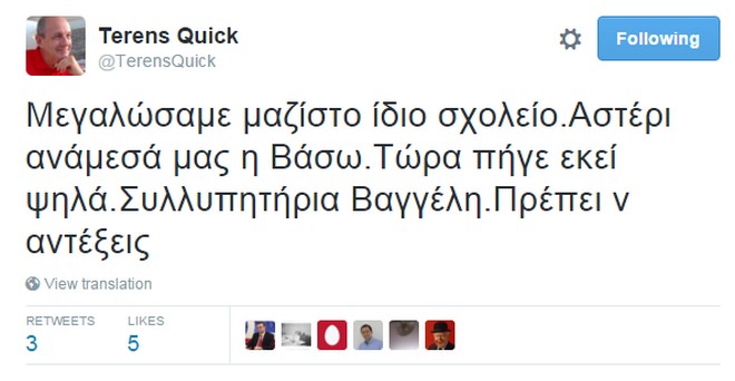 Για το θάνατο της Βάσως Μεϊμαράκη, αδελφής του Βαγγέλη Μεϊμαράκη, ο υφυπουργός παρά τω Πρωθυπουργώ και μέλος του Εθνικού Συμβουλίου των Ανεξάρτητων Ελλήνων Τέρενς Κουίκ, ανέβασε το εξής tweet: «Μεγαλώσαμε μαζί στο ίδιο σχολείο. Αστέρι ανάμεσά μας η Βάσω. Τώρα πήγε εκεί ψηλά. Συλλυπητήρια Βαγγέλη. Πρέπει να αντέξεις».