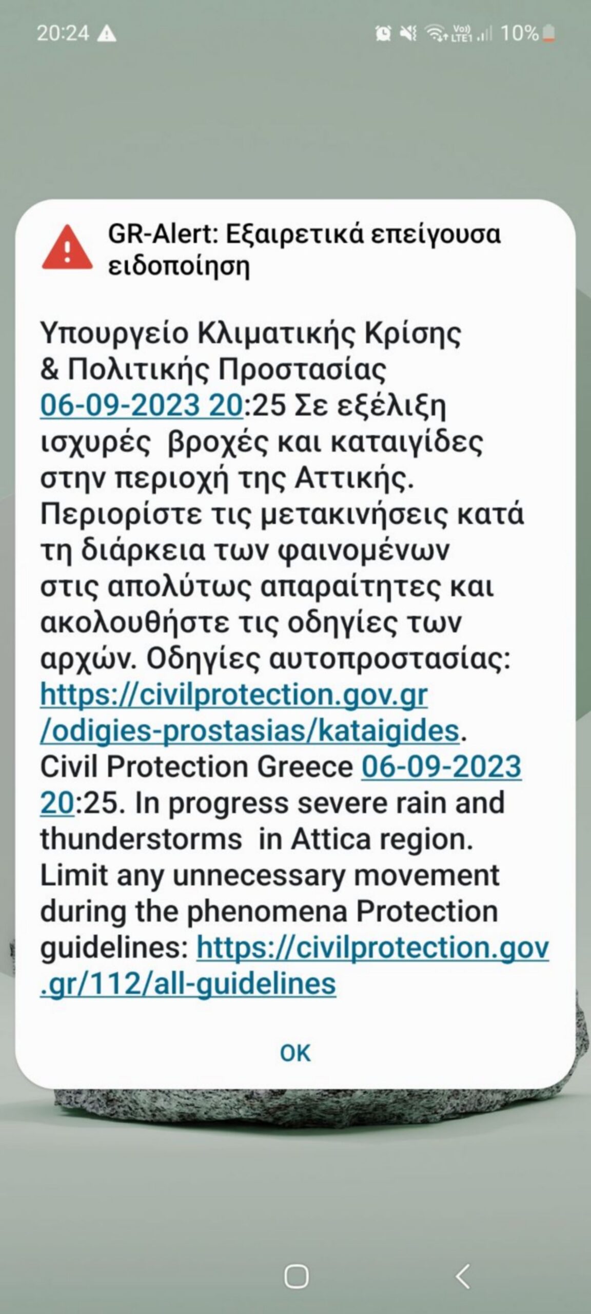 Νωρίς το βράδυ της Τετάρτης και αφού στην Αθήνα οι άνθρωποι παρασέρνονταν από τα ορμητικά νερά σε κεντρικές λεωφόρους της πόλης, ήχησε στα κινητά τηλέφωνα μήνυμα από το 112, με την Πολιτική Προστασία να μας ενημερώνει για το ότι βρίσκονται σε εξέλιξη στην περιοχή ισχυρές βροχές και καταιγίδες, καλώντας μας παράλληλα να περιορίσουμε τις μετακινήσεις κατά τη διάρκεια των φαινομένων.