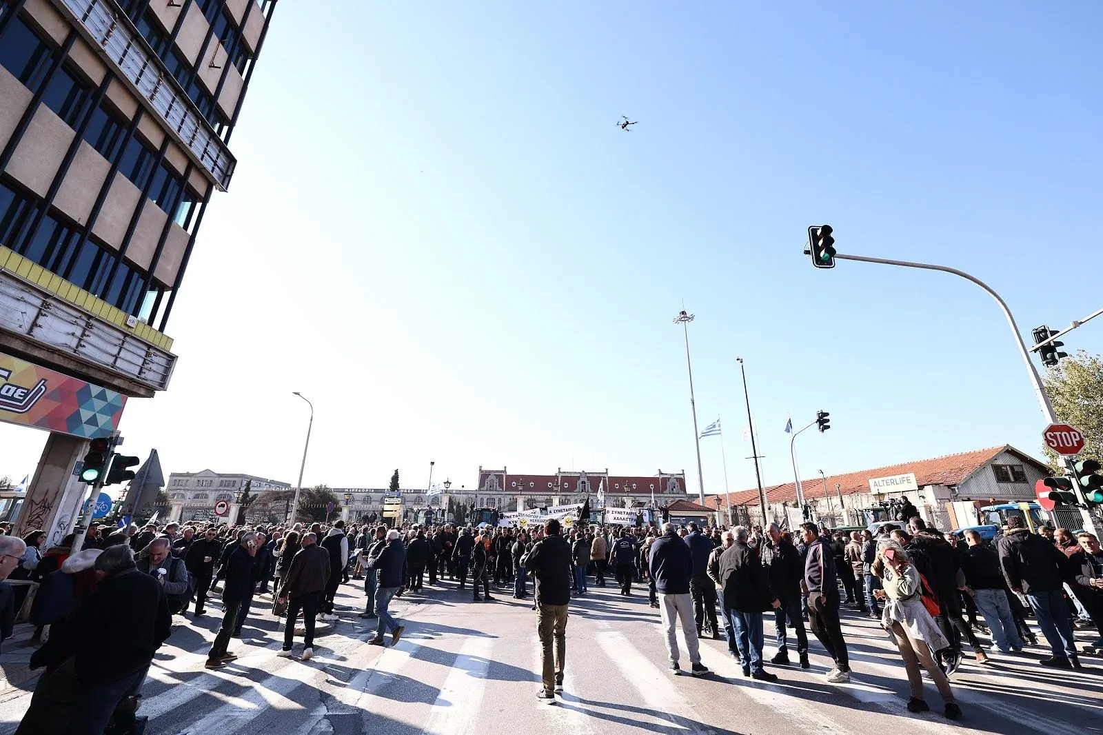 Έξω από την κεντρική πύλη του ΟΛΘ έχουν συγκεντρωθεί εκατοντάδες τρακτέρ και αγροτικά οχήματα και περισσότεροι από 1.000 αγρότες, κτηνοτρόφοι, μελισσοκόμοι και άλλοι παραγωγοί.