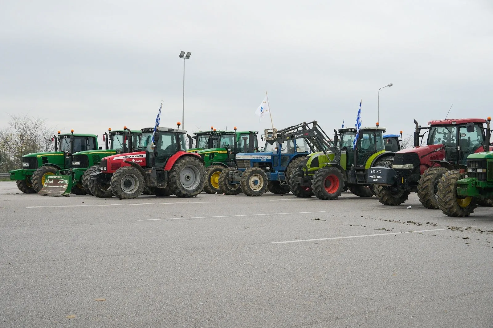 Παρατεταγμένα παραμένουν τα τρακτέρ και τα αγροτικά οχήματα των αγροτών και κτηνοτρόφων στα «Πράσινα Φανάρια», στο κομβικό σημείο της διασταύρωσης πριν από το αεροδρόμιο «Μακεδονία». Λίγα μέτρα πιο μπροστά, παραμένουν εγκατεστημένα αστυνομικά οχήματα οριζόντια επί τους οδοστρώματος, αποτρέποντας έτσι τυχόν μετάβαση παραγωγών στον κόμβο του αεροδρομίου.