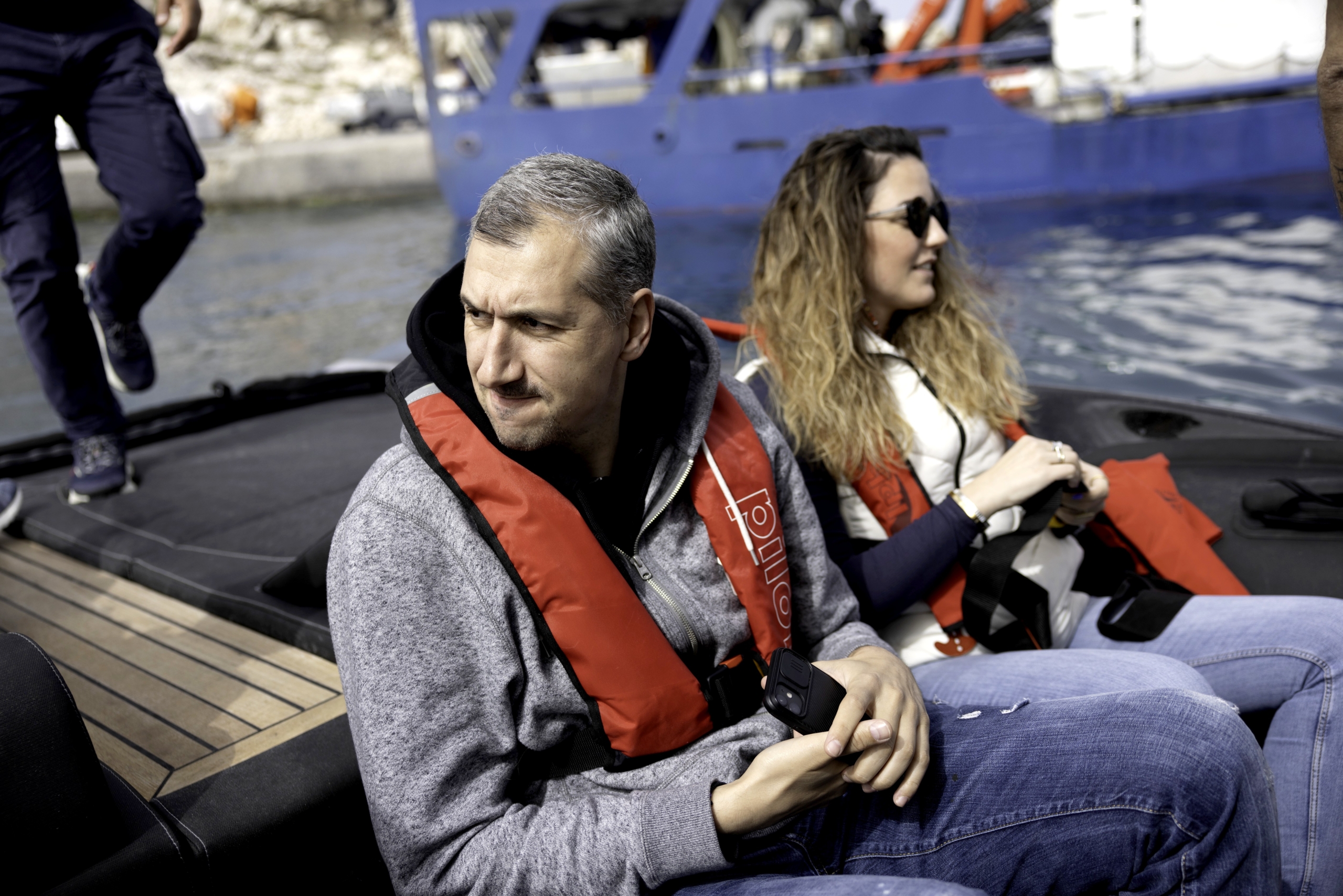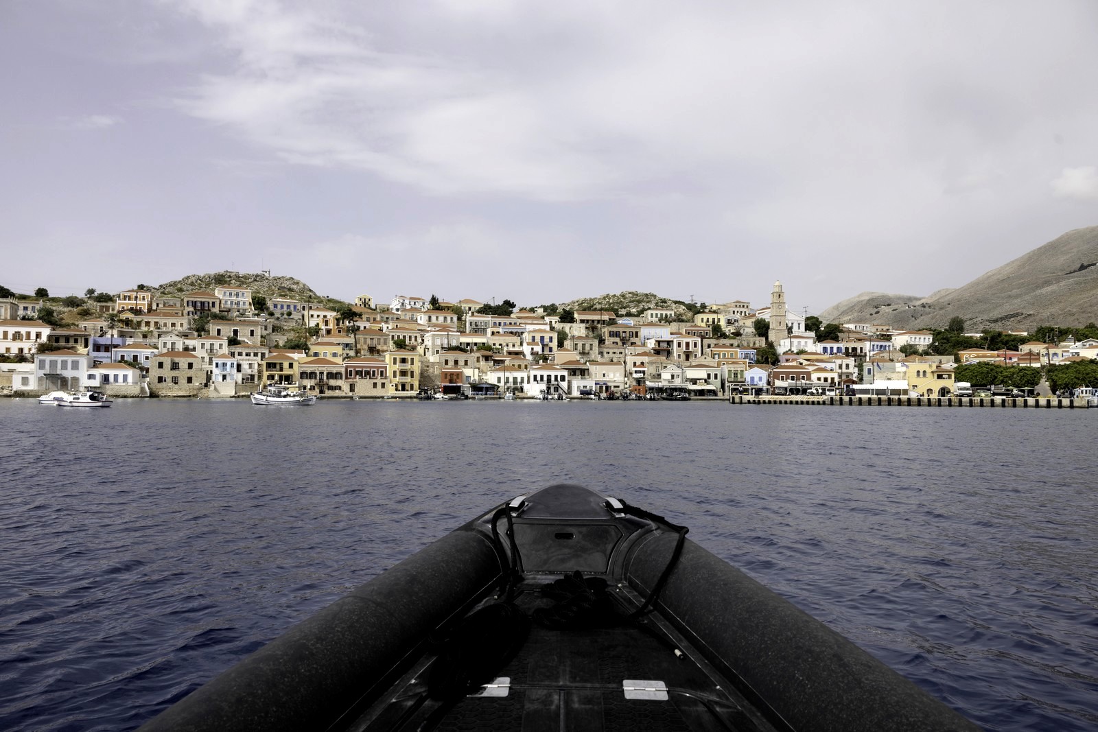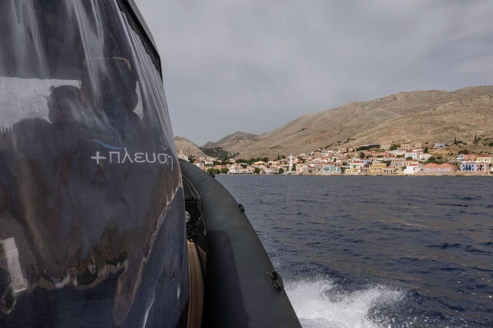 Μετά την άφιξή μας στη Ρόδο και τη μεταφορά μας στο λιμάνι με το βανάκι που μας περίμενε, ζήσαμε την απόλυτη ταξιδιωτική εμπειρία: Μετάβαση στη Χάλκη με φουσκωτό σκάφος, μαζί με τον Δημήτρη Διαμαντίδη, με τον ήλιο να καθρεφτίζει τη θάλασσα και με τον δροσερό, κόντρα αέρα που μας χτύπαγε όσο εμείς “καβαλούσαμε” τα κύματα, να συμπληρώνουν την τέλεια παρέα. Η οποία όμως ήταν πλέον μεγαλύτερη…