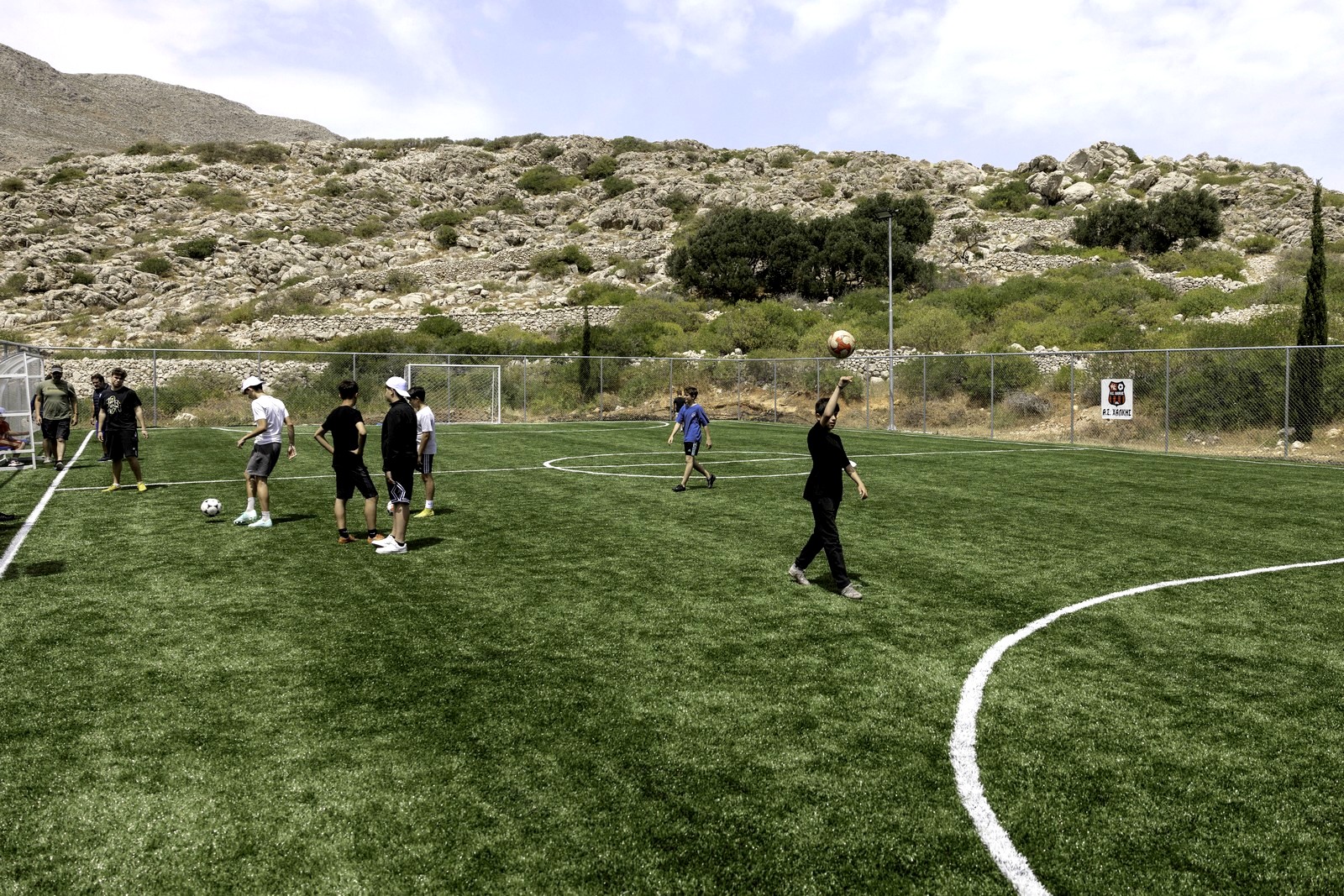 Ένα μικρό διάλειμμα για να δροσιστούμε στην -μοναδική ίσως- καφετέρια του νησιού κι αρχίσαμε να ανηφορίζουμε για το “κυρίως πιάτο” της επίσκεψής μας στη Χάλκη. Αφού περιπλανηθήκαμε σε σοκάκια και σπιτάκια που έμοιαζαν με πίνακες ζωγραφικής, φτάσαμε στο νέο ποδοσφαιρικό στολίδι που, εκείνη τη μέρα, είχε φωτίσει τα πρόσωπα όλων των παιδιών.