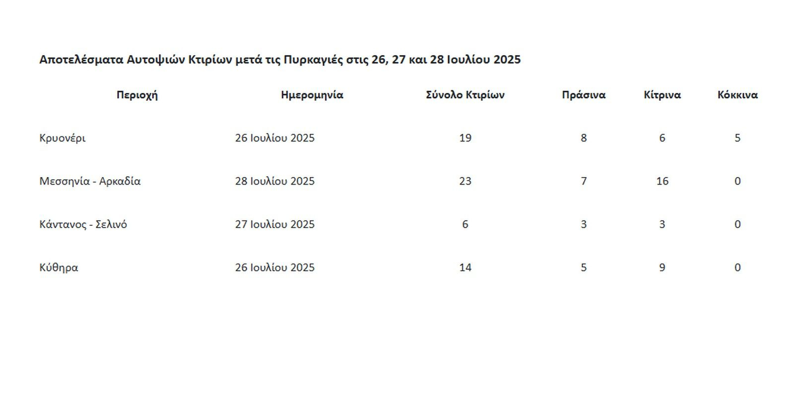 • Κύθηρα (26 Ιουλίου 2025): Από τα 14 κτίρια, 5 πράσινα, 9 κίτρινα, ενώ δεν υπήρχαν κόκκινα.
