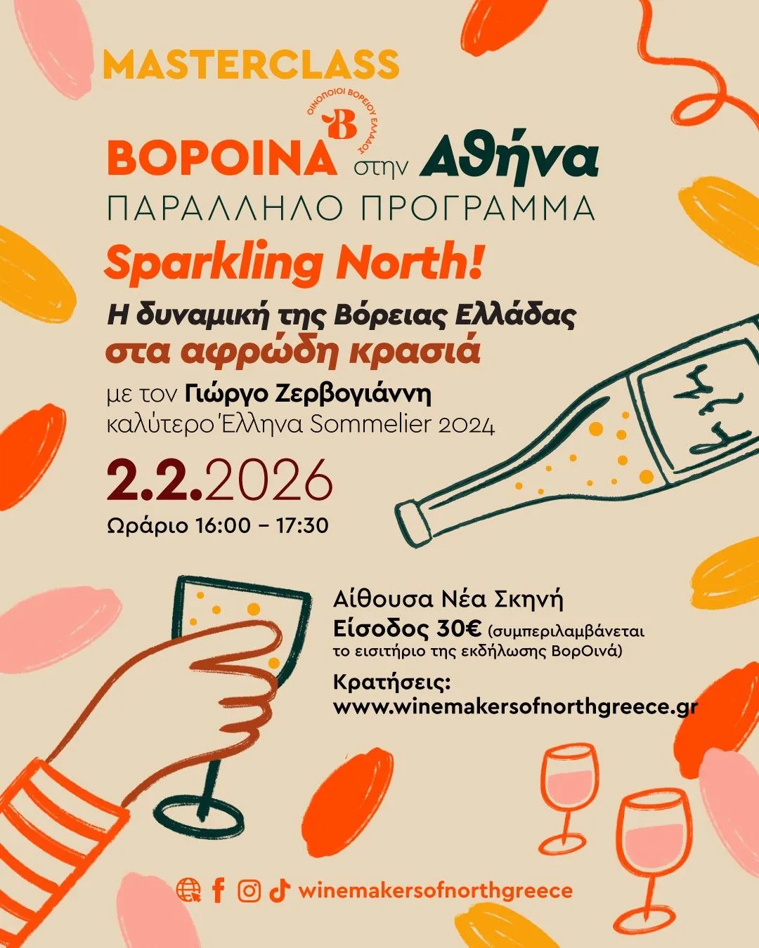 • 16:00 – 17:30 Masterclass «Sparkling North! Η δυναμική της Βόρειας Ελλάδας στα αφρώδη κρασιά» με τον Γιώργο Ζερβογιάννη, καλύτερο Έλληνα Sommelier 2024