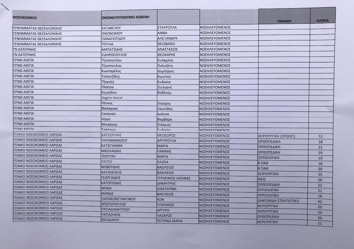 Συγκεκριμένα, 20 άτομα νοσηλεύονται σε ΑΧΕΠΑ, Γεννηματά και Νοσοκομείο Κατερίνης, 22 στο ΓΝΛ, 32 στο ΠΓΝΛ και έξι νοσηλεύονται στις ΜΕΘ στη Λάρισα, ενώ ένα κοριτσάκι 6,5 ετών νοσηλεύεται στην χειρουργική του ΠΓΝΛ.