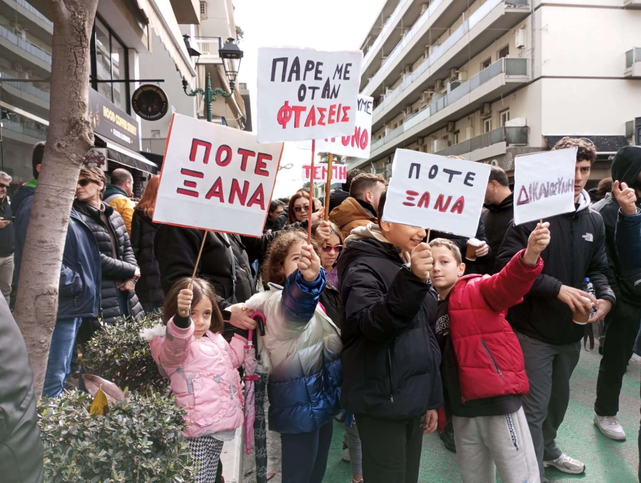 Μια παρέα δε από μικρά παιδιά, συνοδευόμενα από τους γονείς τους κρατούν πλακάτ ζητώντας δικαιοσύνη.