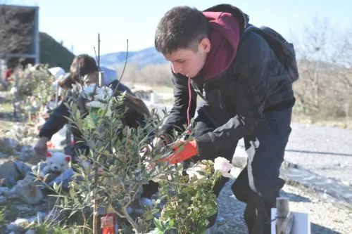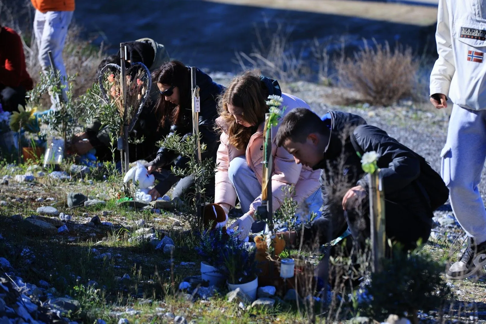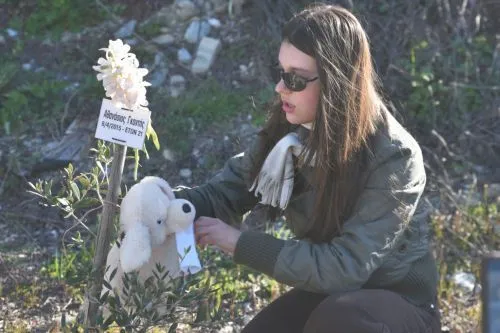 Τα παιδιά, ανέλαβαν επίσης να φροντίσουν τις 57 ελιές που έχουν φυτευτεί στο σημείο και φέρουν τα ονόματα των θυμάτων.