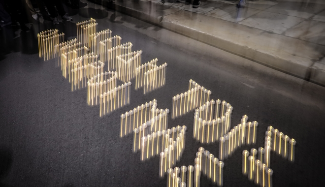 Οι συγκεντρωμένοι σχημάτισαν με τσάντες τη φράση «Δεν ξεχνώ» ενώ με αναμμένα κεριά γράφτηκε το σύνθημα «Τα κέρδη τους, οι νεκροί μας».