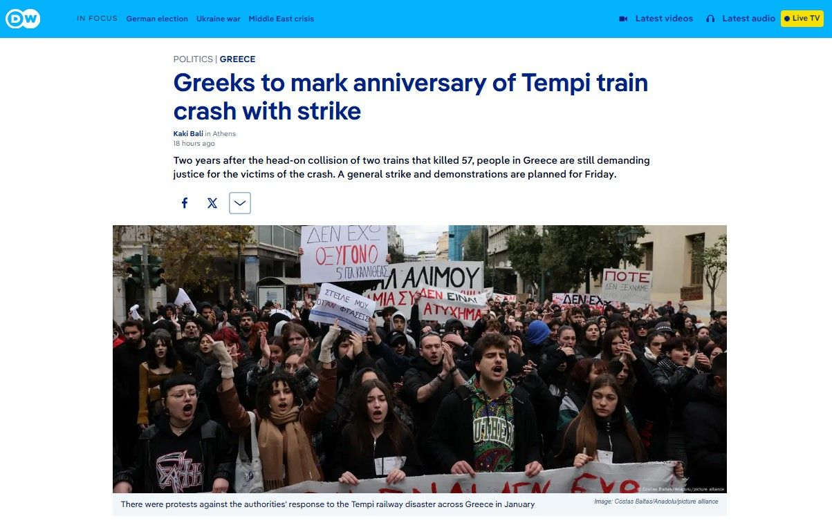 Στις διαδηλώσεις και την απεργία της 28ης Φεβρουαρίου αναφέρεται σε εκτενές άρθρο της και η Deutsche Welle επισημαίνοντας: «Δύο χρόνια αργότερα, οι οικογένειες των θυμάτων και η ελληνική κοινή γνώμη εξακολουθούν να περιμένουν απαντήσεις.